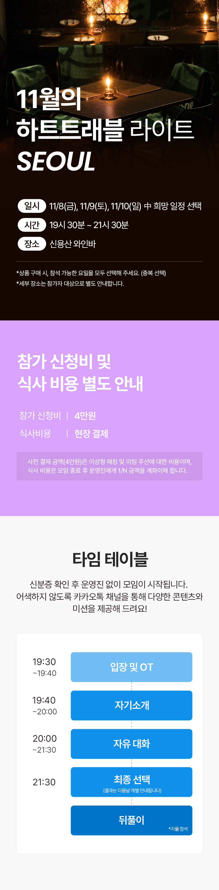 11/8(금), 11/9(토), 11/10(일) 서울 용산에서 저녁 식사와 함께하는 미팅입니다.