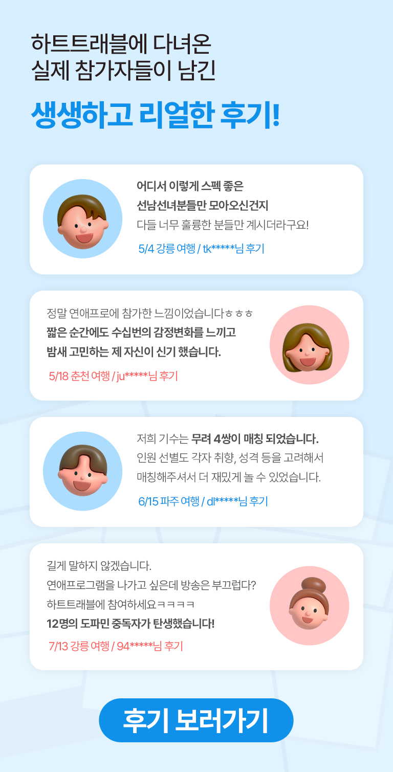 - 신청서에 기재된 정보를 바탕으로 이상형 매칭을 통해 참가자를 선정합니다.