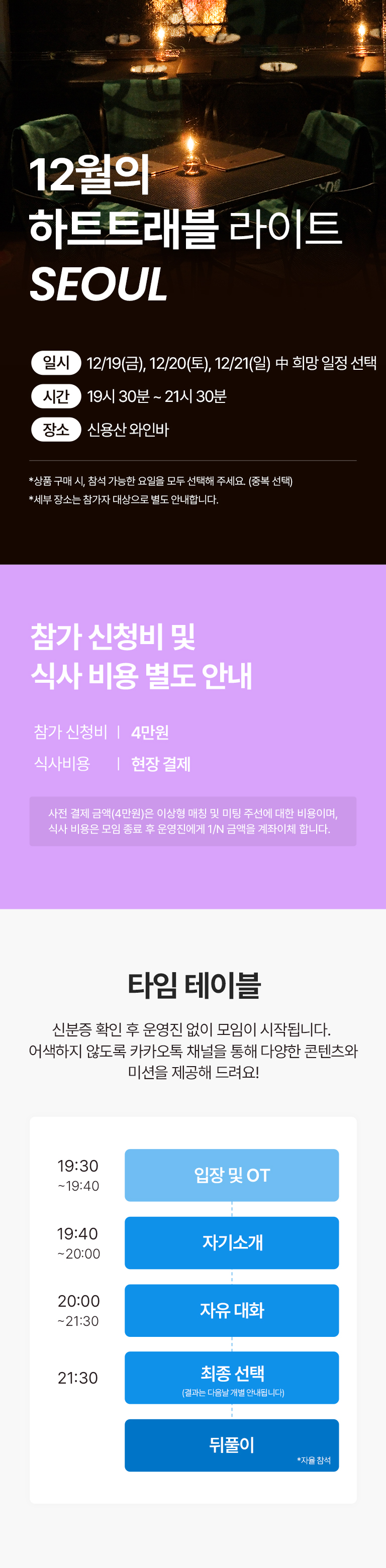 12/19(금), 12/20(토), 12/21(일) 서울 용산에서 저녁 식사와 함께하는 미팅입니다.